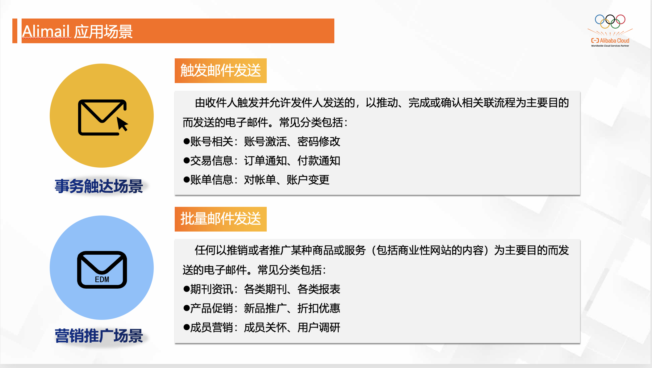 邮件推送 (DirectMail) 是一款简单高效的电子邮件发送服务,它构建在可靠稳定的阿里云基础之上,帮助您快速、精准地实现事务邮件、通知邮件和批量邮件的发送